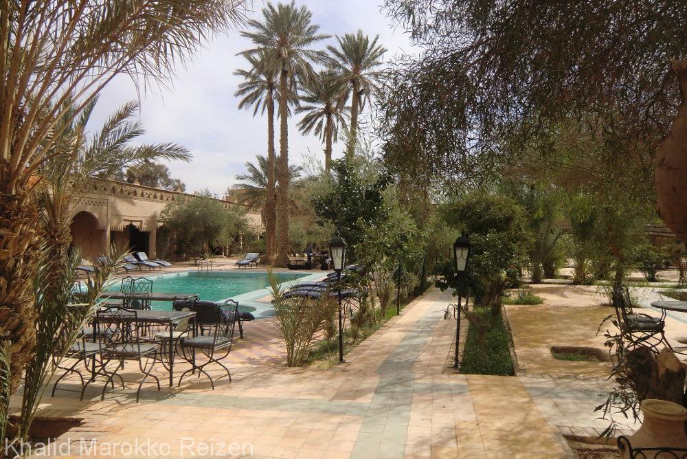 Onderweg worden ruige bergwanden afgewisseld met groene dadelpalmoases. De weg kronkelt door de prachtige vallei van Ziz. Via Er Rachidia en Erfoud kom je bij Rissani, een klein stadje aan de rand van de Sahara. Na Rissani houdt op een gegeven moment de weg op … het is de poort naar de Sahara. Je overnacht in een auberge met zwembad aan de voet van de zandduinen.